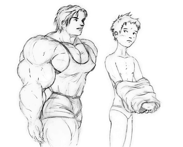 This second picture is called “Far Away – So Close”. It is another comparison of a little guy to a big guy. I expect that the setting might be a locker room, swimming pool or beach. The title gives us some idea of the dynamic between the two characters. Notice how here the two figures are overlapping. The the little guy is just behind the bigger one, his right arm being blocked from our view by the bigger guy’s massive left arm. As a composition it is slightly more complex because the figures overlap. But again the interaction between the characters is limited to the longing gaze of the little guy. Although the two figures are easy to compare, because of the static nature of the composition, the comparison is less compelling.